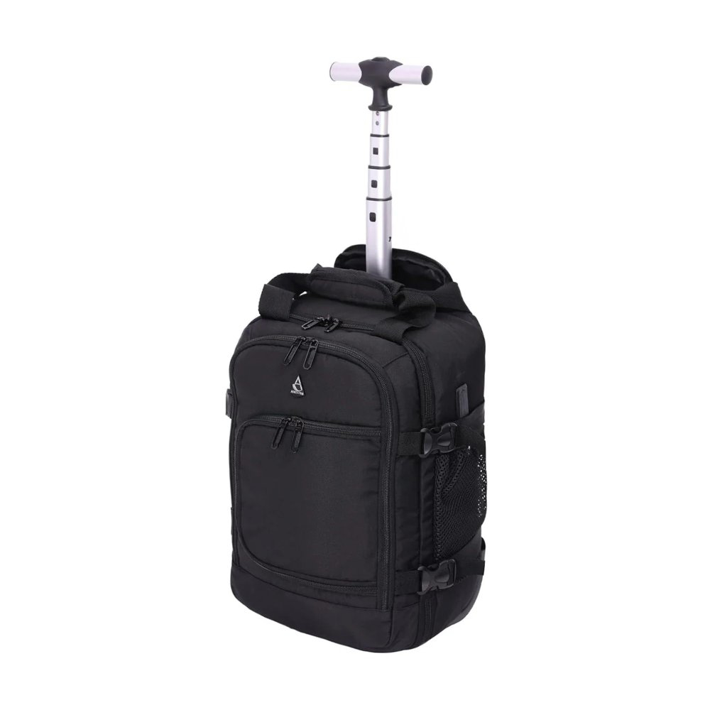Batoh na kolečkách z kolekce AEROLITE. Víceúčelový design 3v1 vám umožní přepravovat věci přesně tak, jak potřebujete: Toto zavazadlo je vybaveno polstrovanou síťovanou zádovou opěrkou a lze ji nosit jako batoh pro přepravu bez použití rukou. Popruhy lze v době nepoužívání uložit do praktické kapsy na zip, která je součástí balení. Batoh lze také přenášet v ruce jako příruční zavazadlo pomocí měkkých vyztužených horních držadel nebo ho lze vézt pomocí teleskopického výsuvného madla. Na zadní straně batohu je umístěn otvor, kterým můžete prostrčit výsuvné madlo cestovního kufru. Tento batoh je ideální pro ty, kteří rádi cestují na lehko. Má tři kapsy na zip: Prostorná hlavní přihrádka je vybavena popruhy na oblečení a obuv. Prostřední kapsa je určena pro vaši techniku; obsahuje kapsu na tablet s úhlopříčkou až 10,1" a menší kapsy na příslušenství. Má také vodotěsnou kapsu na toaletní potřeby. Menší přední kapsa je ideální na psací potřeby a menší věci. Navíc je na boku i držák na láhev s vodou. Taška je vybavena vestavěným USB nabíjecím portem na vnější straně, takže můžete snadno nabíjet svá mobilní zařízení na cestách. Jednoduše vložte svůj vlastní powerpack do vnitřní kapsy (hodí se pro powerpacky do velikosti 18x8x2 cm - powerpack není součástí dodávky) a pomocí dodaného USB kabelu jej připojte k portu. K nabíjení zařízení pak můžete použít vlastní nabíjecí kabel, aniž byste museli po kapsách tahat těžký powerpack. Taška má speciální tajný skrytý oddíl s podšívkou blokující RFID - takže vaše kreditní karty jsou v bezpečí před podvodníky na cestách. Zipy YKK byly pečlivě navrženy tak, aby vyhověly i těm nejnáročnějším testům odolnosti proti oděru a zajistily, že obsah vašeho zavazadla je dobře chráněn. Batoh je trvale udržitelný, protože vnější materiál je vyroben z recyklovaných plastových lahví, což pomáhá životnímu prostředí a zároveň přeměňuje odpad na výrobky, ze kterých můžete mít dobrý pocit. Na batoh se vztahuje 10-ti letá záruka, která se vztahuje na všechny výrobní vady, abyste měli naprostý klid. Tento ekologický batoh na kolečkách má rozměry 40 x 20 x 25 cm, což je přesně maximální povolená velikost, kterou si můžete vzít zdarma do kabiny při letu se společností Ryanair. Je také akceptován prakticky všemi hlavními leteckými společnostmi po celém světě, včetně: Wizzair, EasyJet, British Airways, Emirates, Qatar a Lufthansa a další. • materiál: polyester • rozměry: 40 x 20 x 25 cm • objem: 20 litrů • hmotnost: 2,2 kg • doporučená nosnost 8 kg