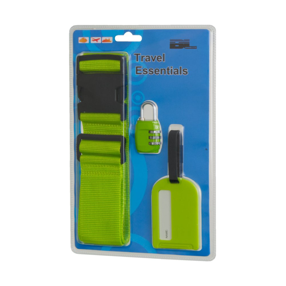 Cestovní set obsahuje tyto 3 položky: 1) Bezpečnostní popruh na kufr s kódovým zámkem Tento cestovní popruh je ideálním řešením pro rozlišení a zabezpečení Vašeho zavazadla. Popruh  je zabezpečen proti otevření kódovým zámkem.   Popruh má extra silnou přezku a je použitelný pro všechny velikosti kufrů. šířka: 5 cm délka: 183 cm 2) Jmenovka na zavazadlo Jmenovka na zavazadlo pro snadnou identifikaci Vašeho zavazadla.  Pro zapsání kontaktních údajů vysuňte štítek. 3) Visací kódový zámek Tento kvalitní kódový zámek je vyroben ze zinkové slitiny.