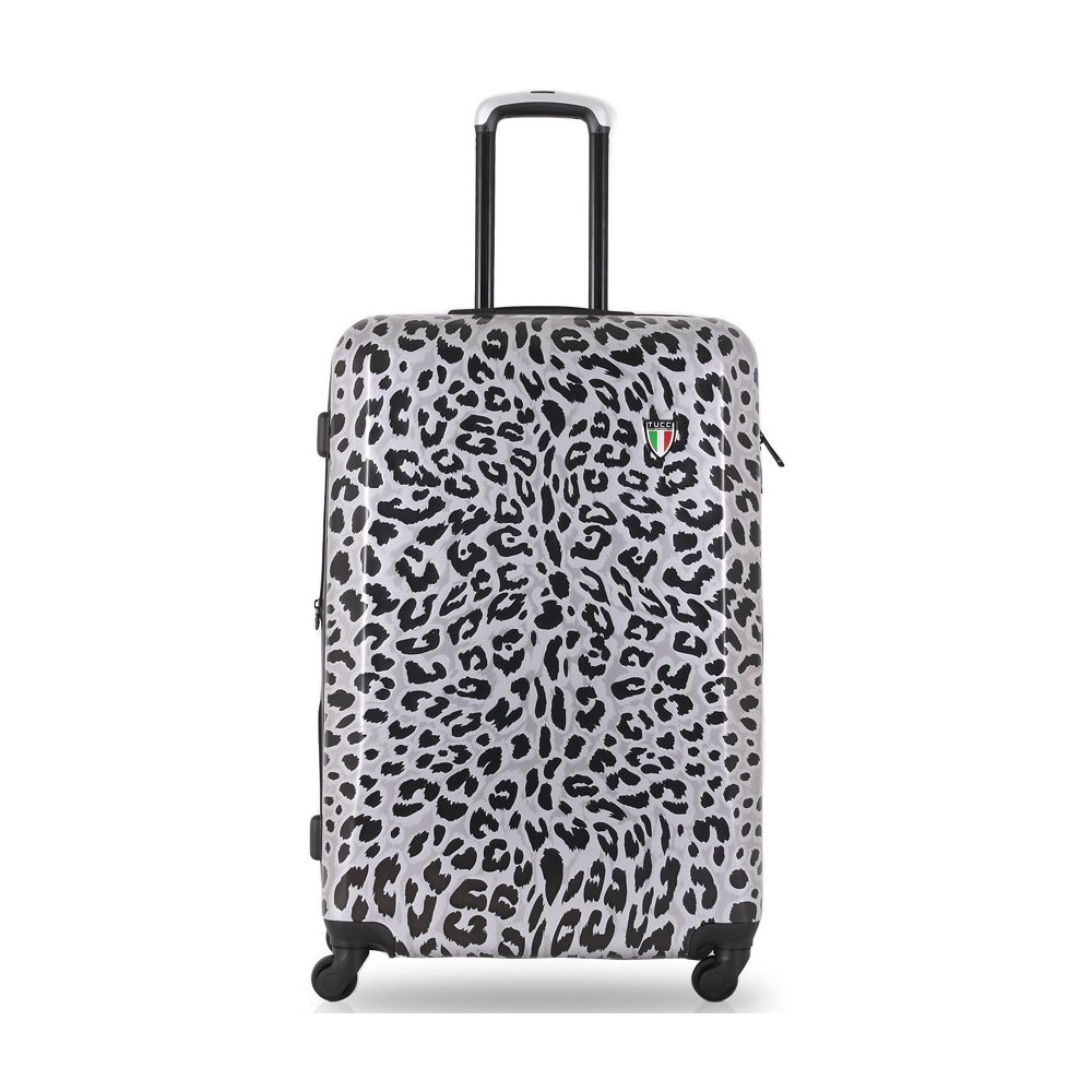 Cestovný kufor TUCCI Winter Leopard je jedinečná kolekcia kufrov Winter Leopard vyrobená kombináciou technológií, umenia a vysokokvalitných materiálov. Kufor má zapínanie na zips. Oba jazdce zipsu majú očká na pohodlné pripevnenie kódového alebo kľúčového zámku. Druhý zips možno použiť na zväčšenie vnútorného objemu kufra. Bočné a horné držadlá sú plastové. Má ľahký výsuvný systém, priehradku na veko a vnútorné vrecká. Celý pojazdný systém je umiestnený vo vnútri kufra pod textilnou podšívkou, aby sa zabránilo poškodeniu systému počas prepravy, a je vybavený štyrmi kolieskami otočnými o 360°. Cena je za 1 ks zobrazenej veľkosti M. - veľkosť M (stredná) - materiál: ABS HARDSEHLL - pružný, ľahký, odolný proti poškriabaniu - jedinečný dizajn - ergonomická gélová rukoväť - vnútorný rozmer: 58 x 41 x 24 cm - vonkajší rozmer: 65 x 44 x 25 cm = rozmery kufra vrátane koliesok a hornej rukoväte - objem: Rozšíriteľný - objem možno zväčšiť až o 35 % - výsuvný systém - 4 kolieska Glide-tech pre vysoký komfort pri používaní, otočné o 360° - 10 rokov záruka