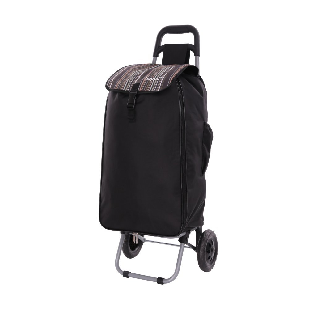 Nákupní taška na kolečkách z kolekce HOPPA. Nákupní taška s kovovou konstrukcí a z voděodolného textilu. Hlavní prostor uzavíratelný stažením je krytý klopou na přezku. Hloubka tašky se dá rozšířit pomocí zipu. Na bocích tašky jsou kapsy a na zadní straně je ještě malá kapsa na zip. Tašku lze složit na plocho. • materiál: polyester • rozměr: 63(95) x 34 x 26 cm + 4 cm (95) = výška tašky včetně koleček a horního madla • rozšiřitelná o cca 15%• objem: 56 l / 64 l při rozšíření • hmotnost: 1,8 kg • doporučená nosnost 15 kg • lehká kovová konstrukce • odnímatelná velká kolečka • voděodolný materiál • skládací na plocho