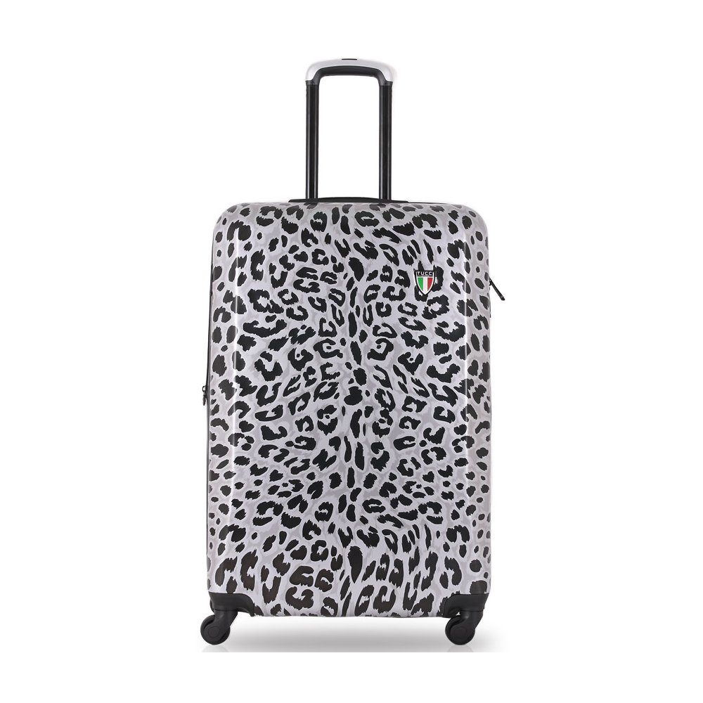Cestovný kufor TUCCI Winter Leopard je jedinečná kolekcia kufrov Winter Leopard vyrobená kombináciou technológií, umenia a vysokokvalitných materiálov. Kufor má zapínanie na zips. Oba jazdce zipsu majú očká na pohodlné pripevnenie kódového alebo kľúčového zámku. Vrchná rukoväť je plastová. Kufrík tejto veľkosti nemá bočné držadlo. Má ľahký teleskopický výsuvný systém, priehradku na veko a vnútorné vrecká. Celý rolovací systém je umiestnený vo vnútri kufra pod textilnou podšívkou, aby sa zabránilo poškodeniu systému počas prepravy, a je vybavený štyrmi kolieskami otočnými o 360°. Cena je za 1 ks zobrazenej veľkosti S. - Veľkosť S (malá) - Materiál: ABS HARDSEHLL - Pružný, ľahký, odolný proti poškriabaniu - Jedinečný dizajn - Ergonomická gélová rukoväť (držadlo) - Vnútorný rozmer: 48 x 34 x 20 cm - Vonkajší rozmer: Objem: 33 l - Hmotnosť: 2,5 kg - Odporúčaná nosnosť 10 kg - Teleskopický výsuvný systém - 4 kolieska Glide-tech pre veľký komfort pri používaní, otočné o 360° - 10 rokov záruka