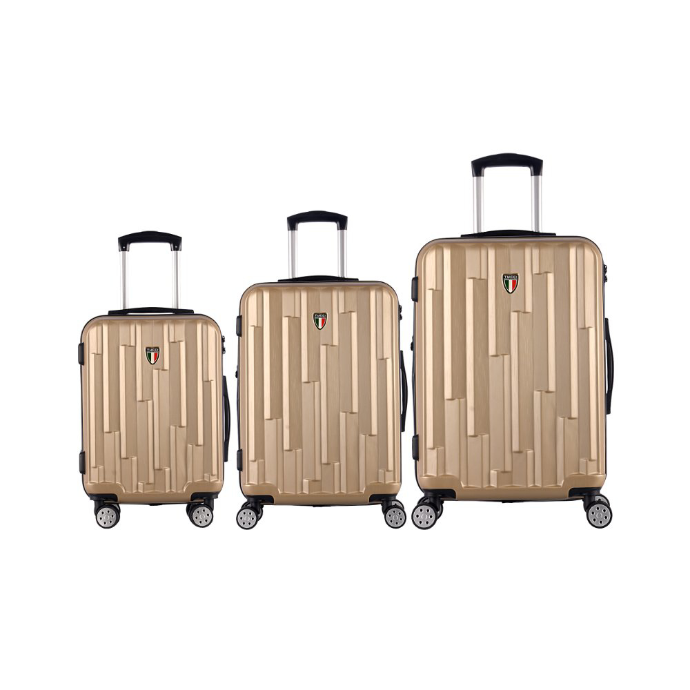 Sada cestovních kufrů z kolekce TUCCI Riflettore.Kufry jsou uzavíratelné zipem. Jezdce zipu se dají zapojit do zapuštěného kódového zámku. Horní i boční madla jsou plastová. U kufrů, kromě nejmenší velikosti S, lze pomocí druhého zipu zvětšit vnitřní objem.Celý pojízdný systém je umístěn uvnitř kufru pod textilní podšívkou, aby nedošlo k poškození systému při přepravě a je opatřen čtyřmi dvojitými kolečky otočnými o 360°. Kufry mají lehký výsuvný systém, vnitřní přepážku a jistící popruhy. Cena je uvedena za 3ks sadu zobrazené velikosti L / M / S. • velikost L (large) / M (medium) / S (small)• materiál: ABS HARDSEHLL - flexibilní, lehký, odolný proti poškrábání• ergonomická gelová rukojeť(madlo)• vnitřní rozměr: 68 x 46 x 29 cm / 58 x 40 x 25 cm / 46 x 34 x 20 cm• vnější rozměr: 76 x 49 x 30 cm / 66 x 43 x 26 cm / 55 x 37 x 21 cm = rozměry kufru včetně koleček a horního madla• objem: 91 l / 58 l + 35% expander / 31 l• rozšiřitelný – objem lze zvětšit až o 35%• hmotnost: 4,5 kg / 3,5 kg / 2,7 kg• doporučená nosnost 25 kg / 20 kg / 10 kg• výsuvný systém (u nejmenší velikosti S je teleskopický)• 4 dvojitá kola pro velký komfort při užívání otočná o 360°• kódový zámek• 10-ti letá záruka