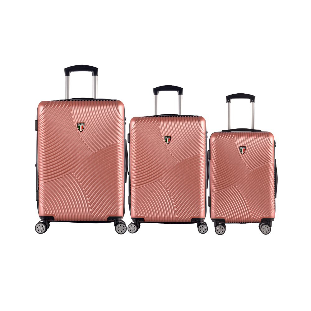 Sada cestovních kufrů z kolekce TUCCI Srotolare. Kufry jsou uzavíratelné zipem. Jezdce zipu se dají zapojit do zapuštěného kódového zámku. Horní i boční madla jsou plastová. U kufrů, kromě nejmenší velikosti S, lze pomocí druhého zipu zvětšit vnitřní objem. Celý pojízdný systém je umístěn uvnitř kufru pod textilní podšívkou, aby nedošlo k poškození systému při přepravě a je opatřen čtyřmi dvojitými kolečky otočnými o 360°. Kufry mají lehký výsuvný systém, vnitřní přepážku a jistící popruhy. Cena je uvedena za 3ks sadu zobrazené velikosti L / M / S. • velikost L (large) / M (medium) / S (small) • materiál: ABS HARDSEHLL - flexibilní, lehký, odolný proti poškrábání • ergonomická gelová rukojeť(madlo) • vnitřní rozměr: 68 x 48 x 28 cm / 58 x 41 x 25 cm / 48 x 34 x 20 cm • vnější rozměr: 76 x 51 x 29 cm / 66 x 44 x 26 cm / 57 x 37 x 21 cm = rozměry kufru včetně koleček a horního madla • objem: 91 l / 59 l + 35% expander / 33 l • rozšiřitelný – objem lze zvětšit až o 35% • hmotnost: 4,5 kg / 3,7 kg / 2,8 kg • doporučená nosnost 25 kg / 20 kg / 10 kg • výsuvný systém (u nejmenší velikosti S je teleskopický) • 4 dvojitá kola pro velký komfort při užívání otočná o 360° • kódový zámek • 10-ti letá záruka